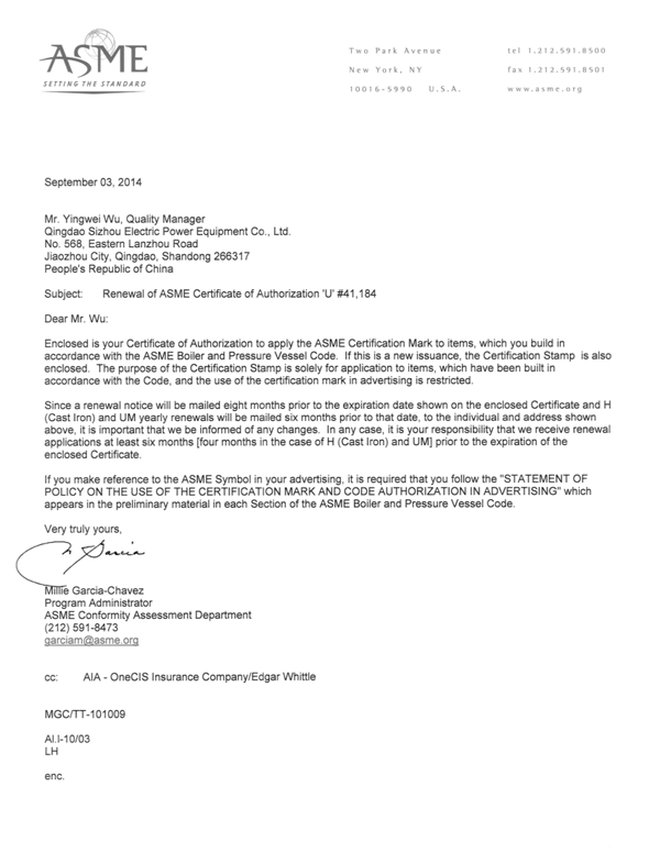 2014年7月17日至18日,?ASME審核組對我公司進行為期兩天的換證審核工作。ASME審核通過對我公司以往ASME產品的資料的審查;對設計、焊接、探傷、原材料檢驗、現(xiàn)場示范產品的演示、倉庫及標識移植等各個環(huán)節(jié)相關人員的審核,作業(yè)程序抽查和現(xiàn)場抽樣的審核,ASME審核組對我們公司的ASME體系運行給予高度評價,認為我公司完全具備設計和制造ASME規(guī)范要求的產品的能力,此次換證審核順利通過。 |